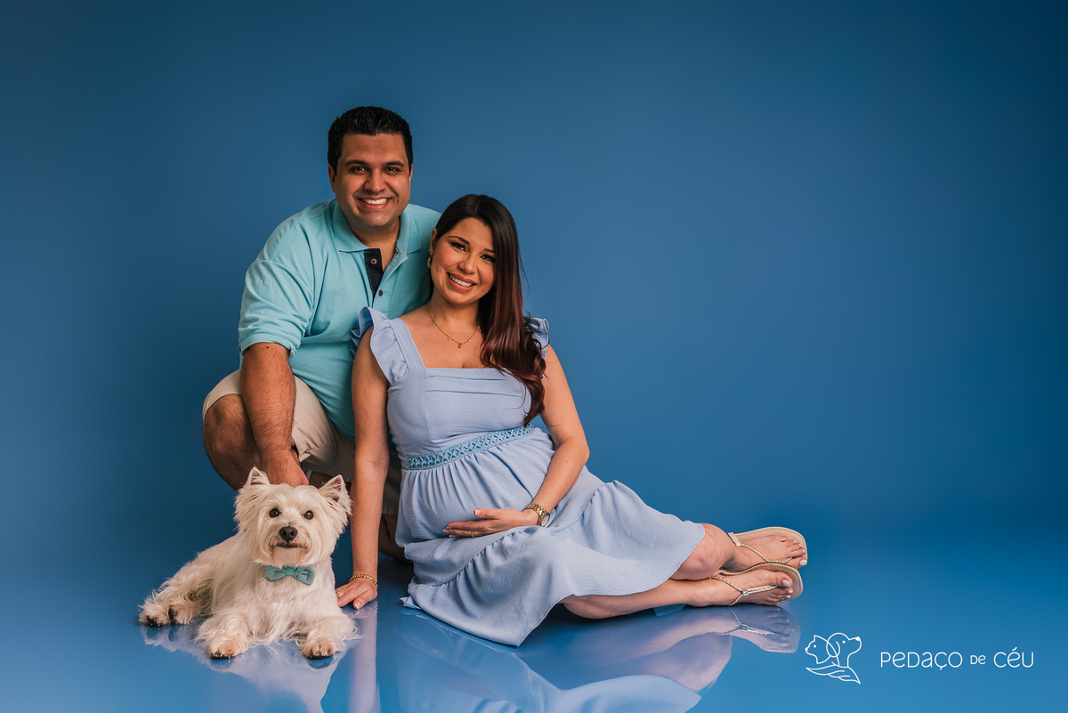 O ensaio foi realizado para marcar a gestação da Lívia e registrar essa fase única em que Joaquim acompanhou cada momento da espera. Todas as fotos tiveram a presença dele, reforçando seu papel especial na vida da família. O cenário escolhido foi o fundo azul, em harmonia com o chá de bebê que viria em seguida, criando uma memória visual afetiva e coerente com esse momento.
